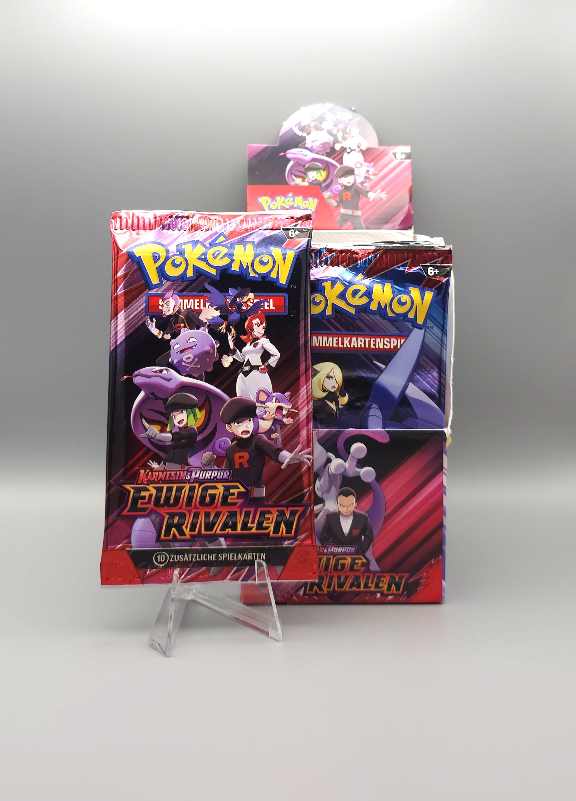 Sei auf der Hut, Trainer! Das schurkische Team Rocket setzt seinen neuesten Plan in Bewegung und tapfere Trainer eilen herbei, um ihn zu vereiteln. Verbünde dich mit Cynthia und Knakrack-ex, Klarin und Ho-Oh-ex oder Pepper und Mastifioso-ex ... Vielleicht erklärst du ja auch deine Loyalität für Giovanni und kämpfst unter seinem Befehl neben Team Rockets Pokémon wie Mewtu-ex! Entscheide dich für eine Seite, trommle deine Verbündeten zusammen und stürze dich in der Pokémon-Sammelkartenspiel-Erweiterung Karmesin & Purpur – Ewige Rivalen kühn in den Kampf!
